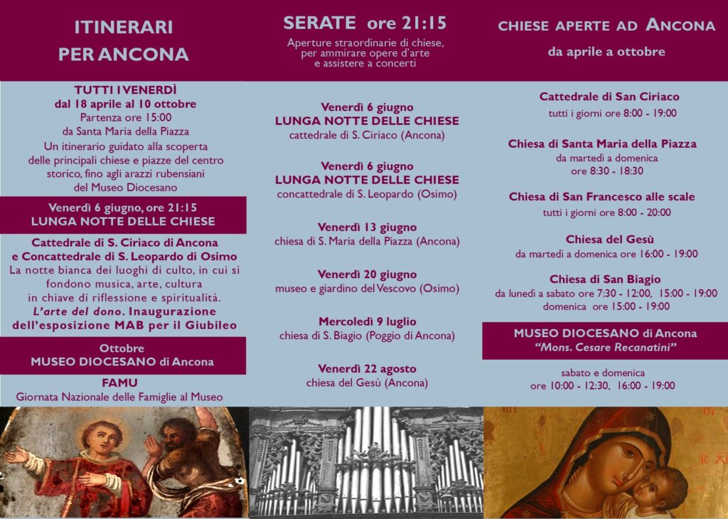 Non mancheranno le suggestive aperture serali delle chiese della Diocesi, con un format che alterna letture storico-artistiche a cura delle guide del Museo e concerti delle associazioni musicali del territorio. Il programma inizierà con “La lunga notte delle chiese” venerdì 6 giugno alle 21:15, coinvolgendo la Cattedrale di San Ciriaco di Ancona e la Concattedrale di San Leopardo di Osimo con l’inaugurazione delle esposizioni per il Giubileo del progetto MAB intitolate “L’arte del dono”.